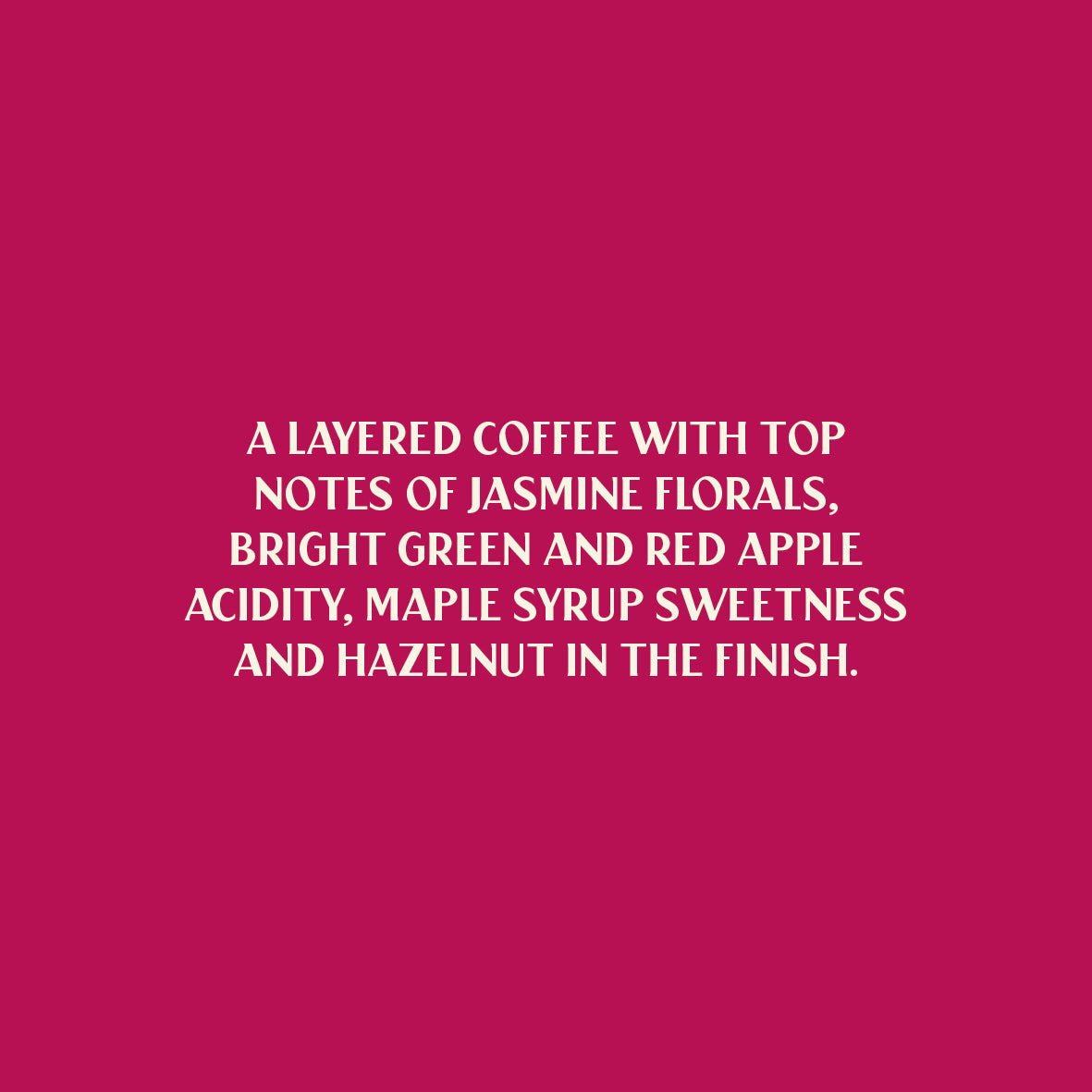 Tasting Notes: A layered coffee with top notes of jasmine florals, bright green and red apple acidity, maple syrup sweetness and hazelnut in the finish.