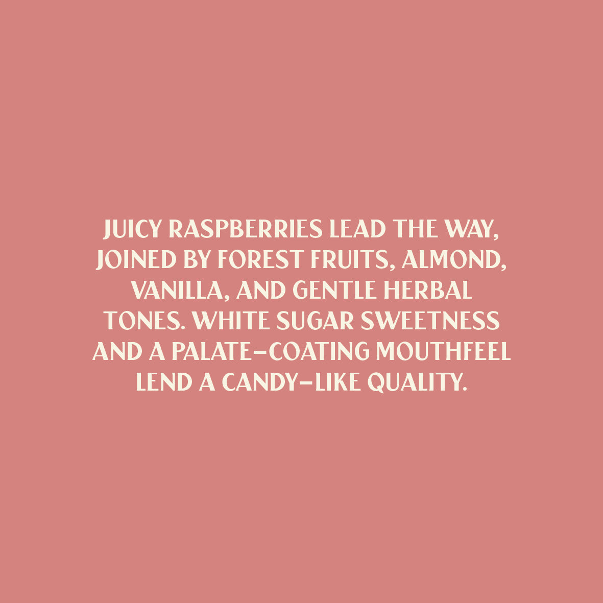 Tasting Notes: Juicy raspberries lead the way, joined by forest fruits, almond, vanilla, and gentle herbal tones. White sugar sweetness and a palate-coating mouthfeel lend a candy-like quality.